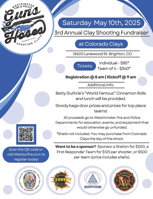 « All Events This event has passed. Westminster Fire and Police Clay Shoot at Colorado Clays May 12 @ 8:00 am - 5:00 pm MDT « NoCo Pheasants Forever Chapter Meeting TUNE Camp » Add to calendar Google Calendar iCalendar Outlook 365 Outlook Live Details Date: May 12 Time: 8:00 am - 5:00 pm MDT Event Category: News Event Tags:Colorado Clays, Guns & Hoses, Westminster Fire & Police Website: https://www.westycfire.com/ Venue Colorado Clays 13600 Lanewood St Brighton, CO 80603 United States + Google Map